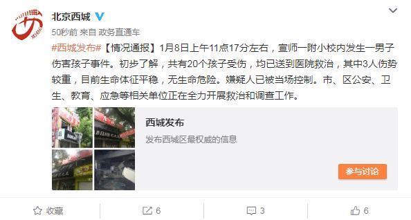有媒體報(bào)道稱,今天上午11時(shí)左右,北京西城區(qū)宣師一附小右安校區(qū)內(nèi),有人持械襲擊小學(xué)生,多名小學(xué)生受傷,有1人重傷。傷員據(jù)稱轉(zhuǎn)移至宣武醫(yī)院等醫(yī)院救治。有《宣武醫(yī)院》工作人員8日對(duì)《環(huán)球時(shí)報(bào)》記者證實(shí),至少有十幾個(gè)宣師附小的學(xué)生正在宣武醫(yī)院進(jìn)行救治,其中兩名在神經(jīng)外科搶救,一名在骨科搶救。