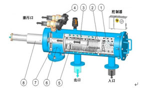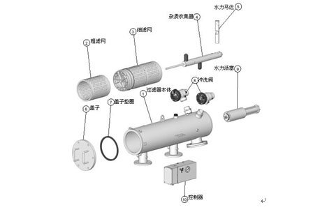 水力驅動自清洗過濾器由主管組件、端蓋組件、細濾芯組件、粗濾芯組件、吸污器組件、水力馬達、水力缸組件、排污閥、管路控制系統等主要零部件組成。水由入水 口進入過濾器,首先經過粗濾芯組件濾掉圈套顆粒的雜質,然后到達細濾網,通過細濾網濾除細小顆粒的雜質后,清水由出水口排出。