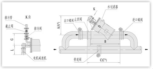 | 型號 | 管徑 (mm) | 過濾流量 (m3/h) | 過濾面積 (cm3) | 排污閥DN (mm) | 一次清洗 水量(L) | 電機(jī)功率 (KW) | 重量 (Kg) | D (mm) | A (mm) | A (mm) | B (mm) | C (mm) | C (mm) | L (mm) | G (mm) |