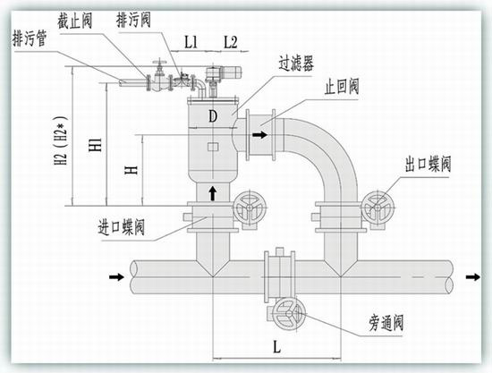 | 型號 | 管徑 (mm) | 過濾 流量 (m3/h) | 過濾 面積 (cm2) | 排污 閥DN (mm) | 一次清 洗水量 (L) | 電機(jī) 功率 (KW) | 重量 (Kg) | D (mm) | H (mm) | H1 (mm) | H2 (mm) | H2 (mm) | L1 (mm) | L2 (mm) | L (mm) |