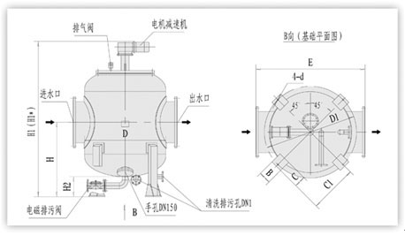 | 型號 | 管徑 mm | 過濾 流量 m3/h | 過濾面積 cm2 | 電磁排污閥DN1 mm | 一次清洗水量L | 清洗排污閥DN1 mm | 電機(jī)功率 KW | 重量 Kg | D mm | H mm | H1 mm | H1 mm | H2 mm | E mm | D1 mm | B mm | C mm | C1 mm | D mm |